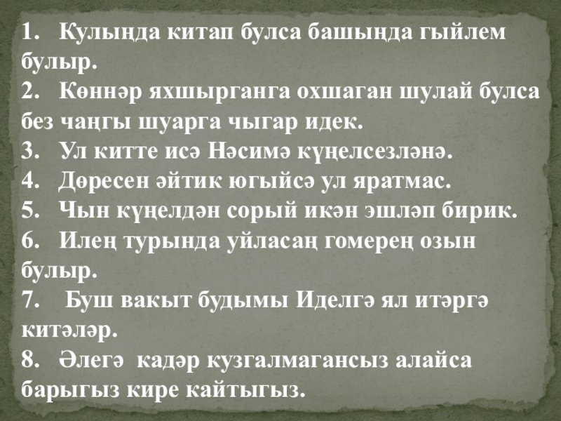 1.  Кулыңда китап булса башыңда гыйлем булыр.2.  Көннәр яхшырганга охшаган шулай булса без чаңгы шуарга