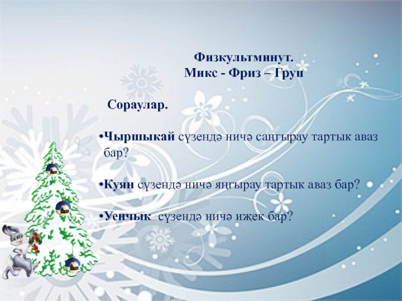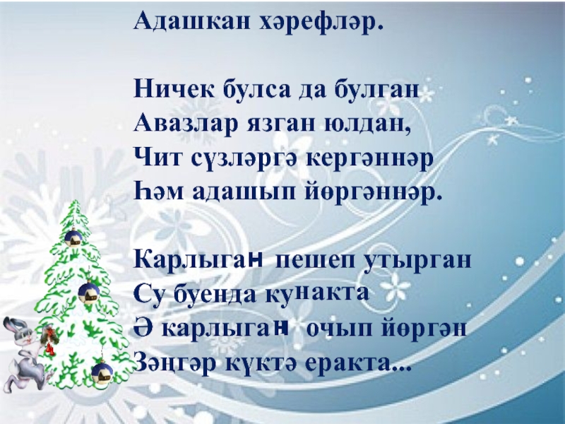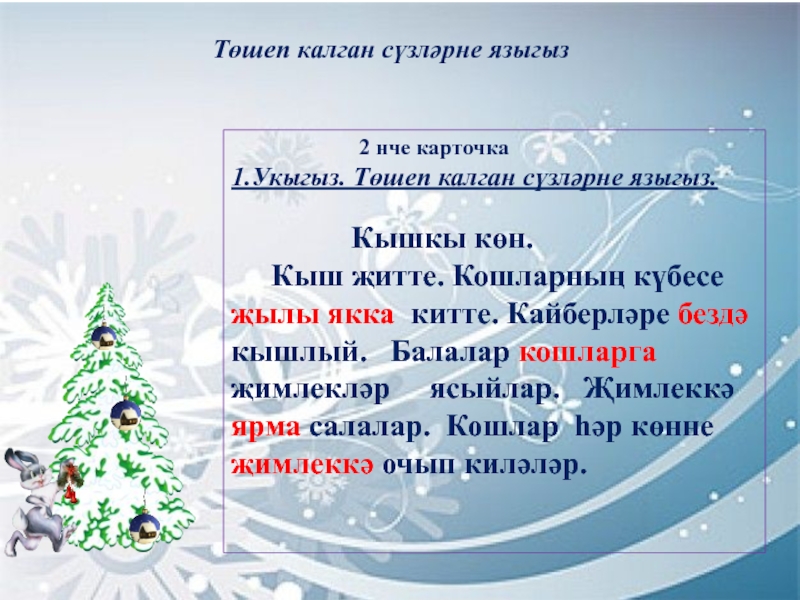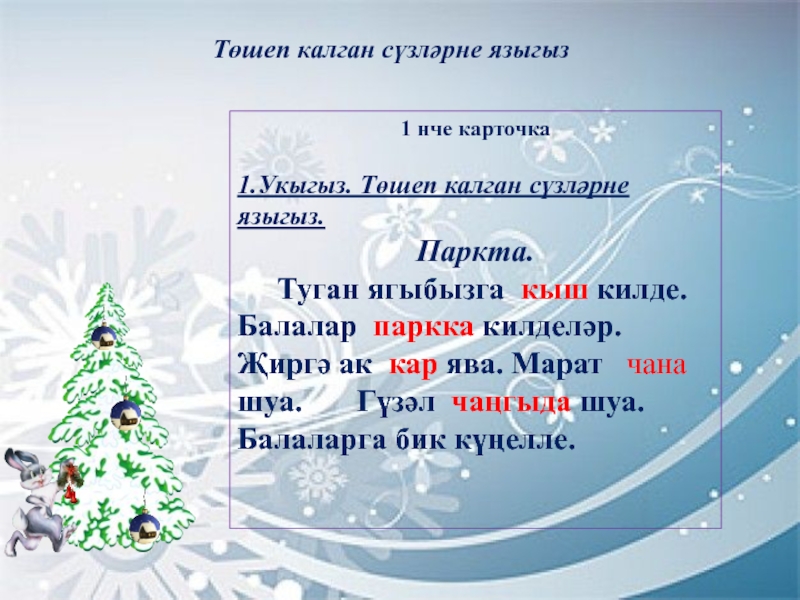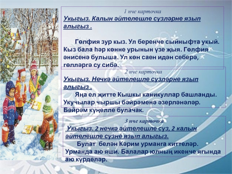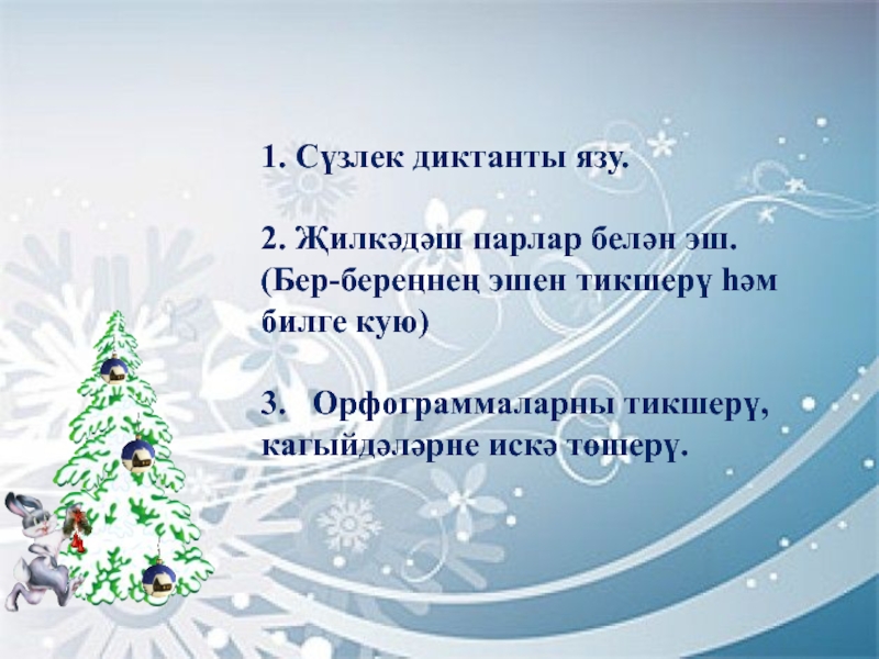 Яңа ел җитте Кышкы каникуллар башланды. Укучылар чыршы бәйрәменә әзерләнәләр. Бәйрәм күңелле булачак.