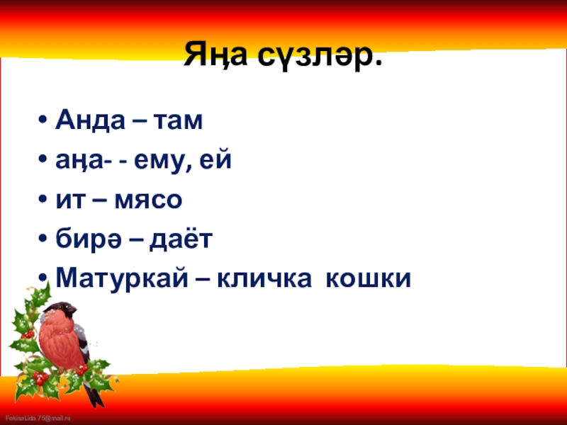 Яӊа сүзләр.Анда – тамаӊа- - ему, ейит – мясобирә – даётМатуркай – кличка кошки