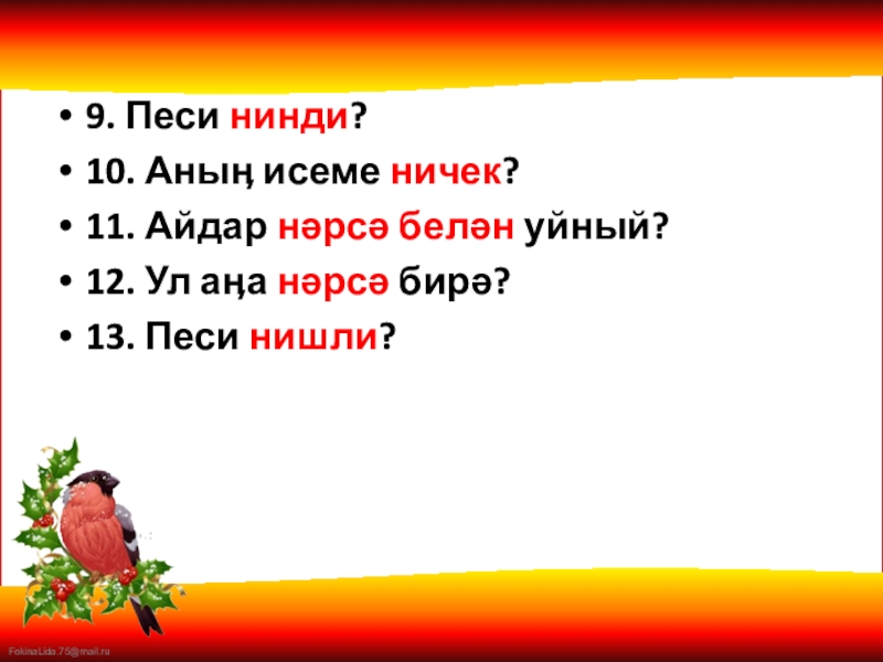 9. Песи нинди?10. Аныӊ исеме ничек?11. Айдар нәрсә белән уйный?12. Ул аӊа нәрсә бирә?13. Песи нишли?