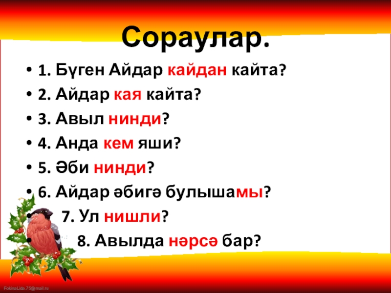 Сораулар.1. Бүген Айдар кайдан кайта?2. Айдар кая кайта?3. Авыл нинди?4. Анда кем яши?5. Әби нинди?6. Айдар әбигә