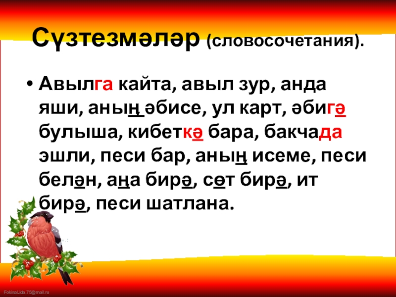 Сүзтезмәләр (словосочетания).Авылга кайта, авыл зур, анда яши, аныӊ әбисе, ул карт, әбигә булыша, кибеткә бара, бакчада эшли,