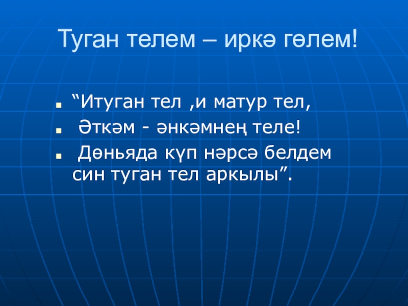 Туган телем – иркә гөлем!“Итуган тел ,и матур тел, Әткәм - әнкәмнең теле! Дөньяда күп нәрсә белдем