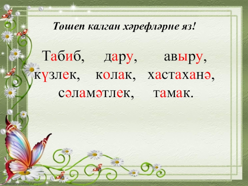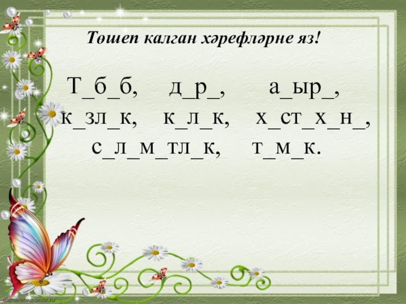 Төшеп калган хәрефләрне яз!  Т_б_б,   д_р_,    а_ыр_,   к_зл_к,