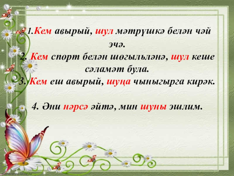 Слайд 6 1.Кем авырый, шул мәтрүшкә белән чәй эчә. 2. Кем спорт белән