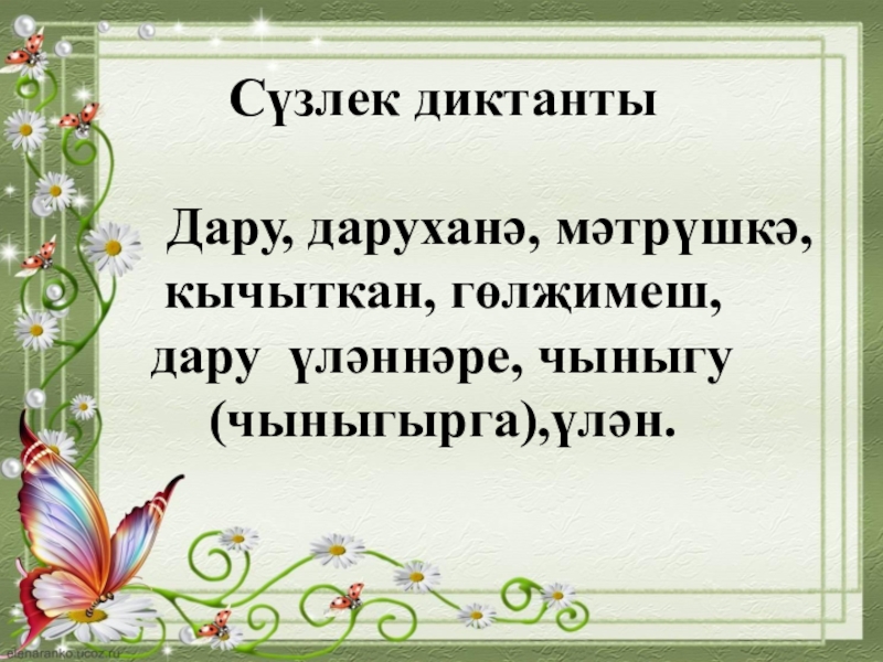 Слайд 4Сүзлек диктанты Дару, даруханә, мәтрүшкә, кычыткан, гөлҗимеш, дару