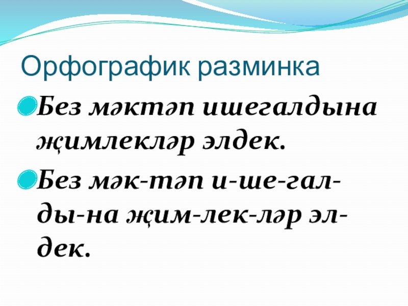 Орфографик разминкаБез мәктәп ишегалдына җимлекләр элдек.   Без мәк-тәп и-ше-гал-ды-на җим-лек-ләр эл-дек.