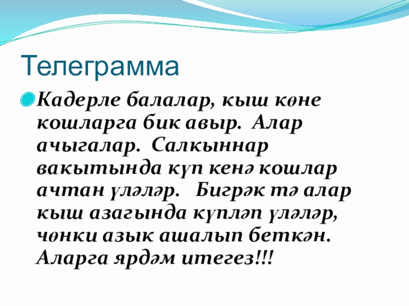 ТелеграммаКадерле балалар, кыш көне кошларга бик авыр. Алар ачыгалар. Салкыннар вакытында күп кенә кошлар ачтан үләләр.