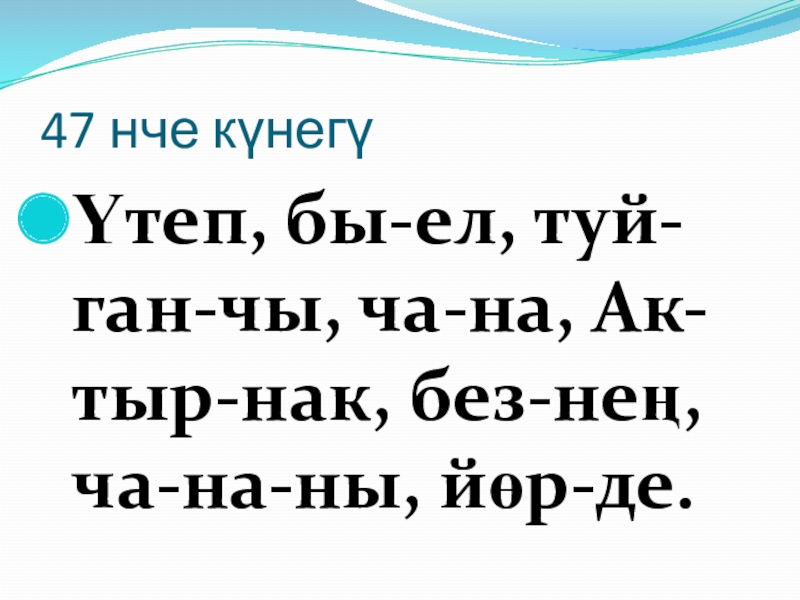 47 нче күнегүҮтеп, бы-ел, туй-ган-чы, ча-на, Ак-тыр-нак, без-нең, ча-на-ны, йөр-де.