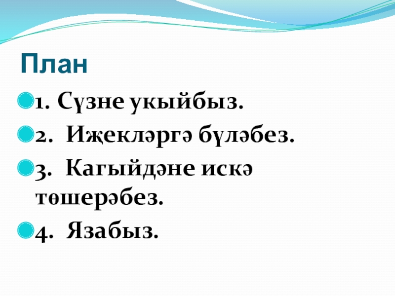 План1. Сүзне укыйбыз.2. Иҗекләргә бүләбез.3. Кагыйдәне искә төшерәбез.4. Язабыз.