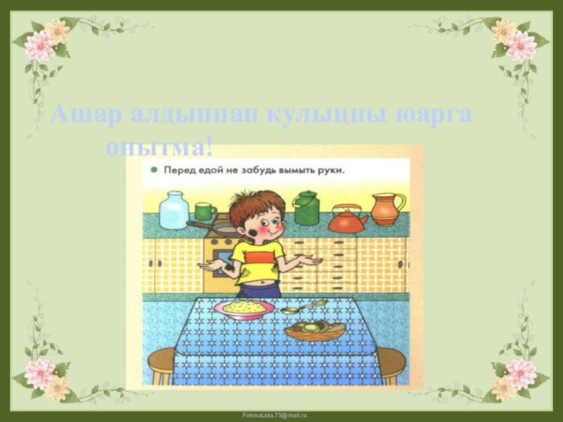 Слайд 8Ашар алдыннан кулыңны юарга онытма!