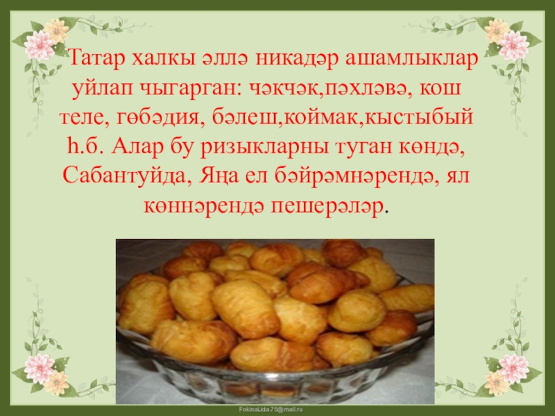 Слайд 4 Татар халкы әллә никадәр ашамлыклар уйлап чыгарган: чәкчәк,пәхләвә, кош теле,