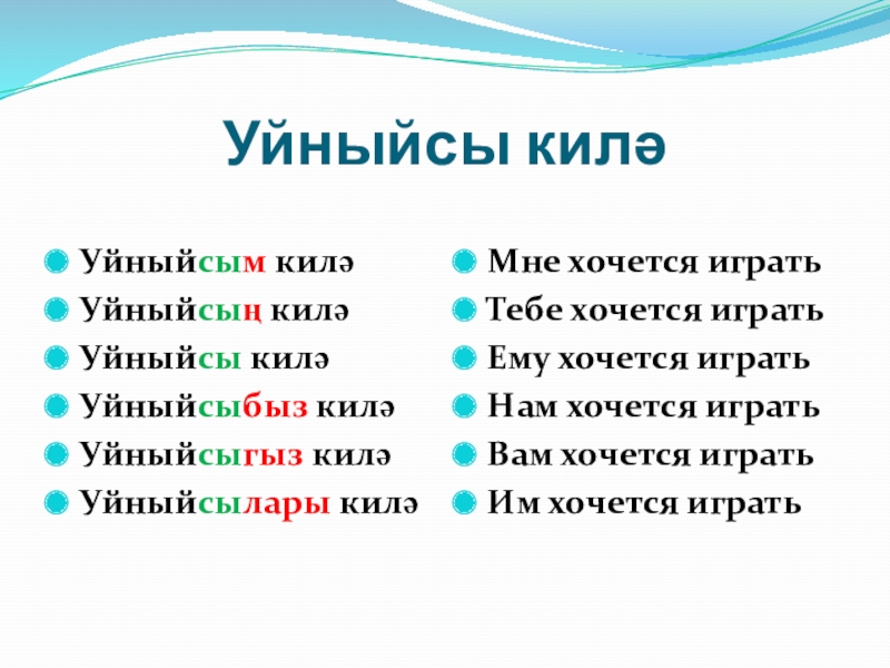 1.Уйныйсым килә, уйнарга телим, уйный.