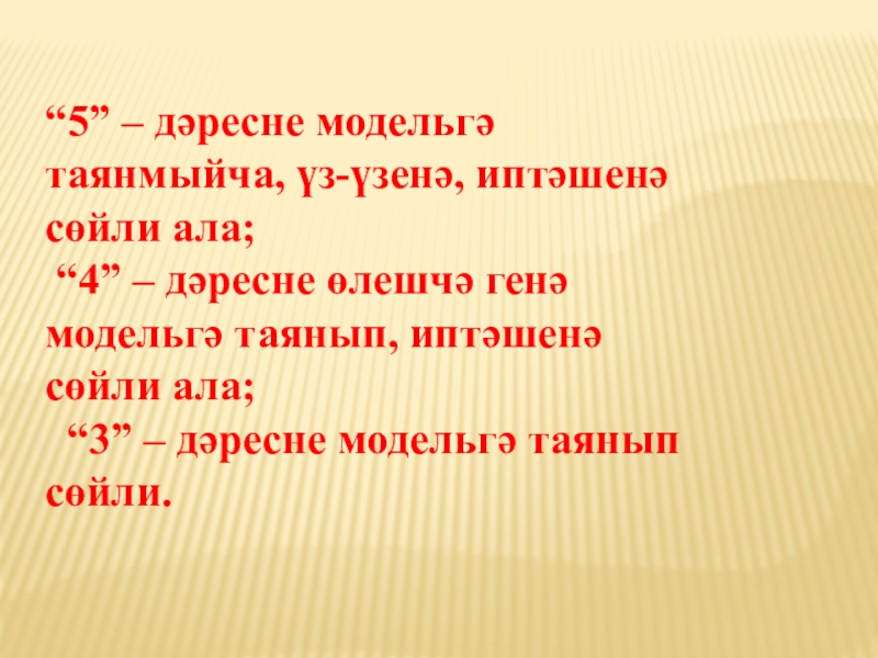 Слайд 27“5” – дәресне модельгә таянмыйча, үз-үзенә, иптәшенә сөйли ала;