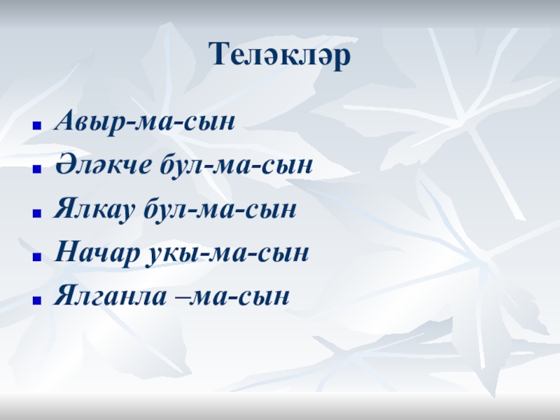 ТеләкләрАвыр-ма-сынӘләкче бул-ма-сынЯлкау бул-ма-сынНачар укы-ма-сынЯлганла –ма-сын