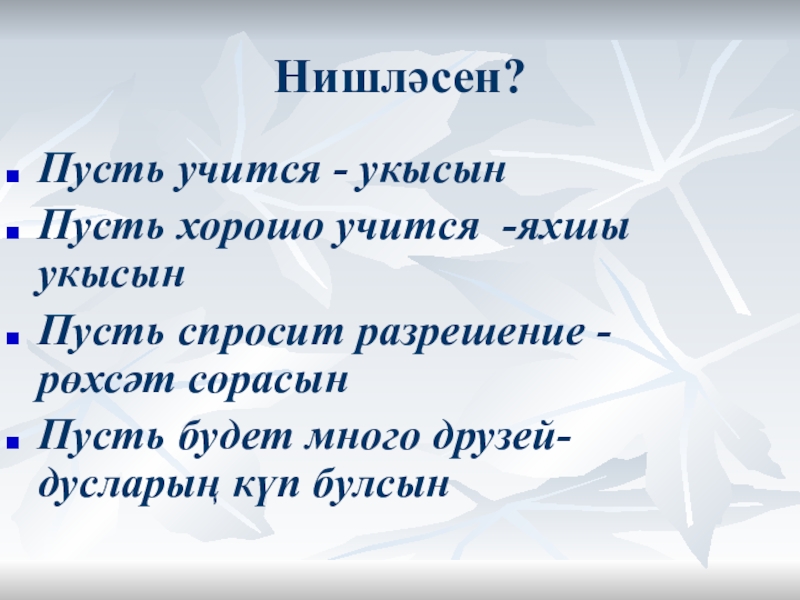 Нишләсен?Пусть учится - укысынПусть хорошо учится -яхшы укысынПусть спросит разрешение -рөхсәт сорасынПусть будет много друзей-дусларың күп булсын