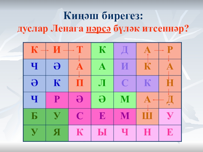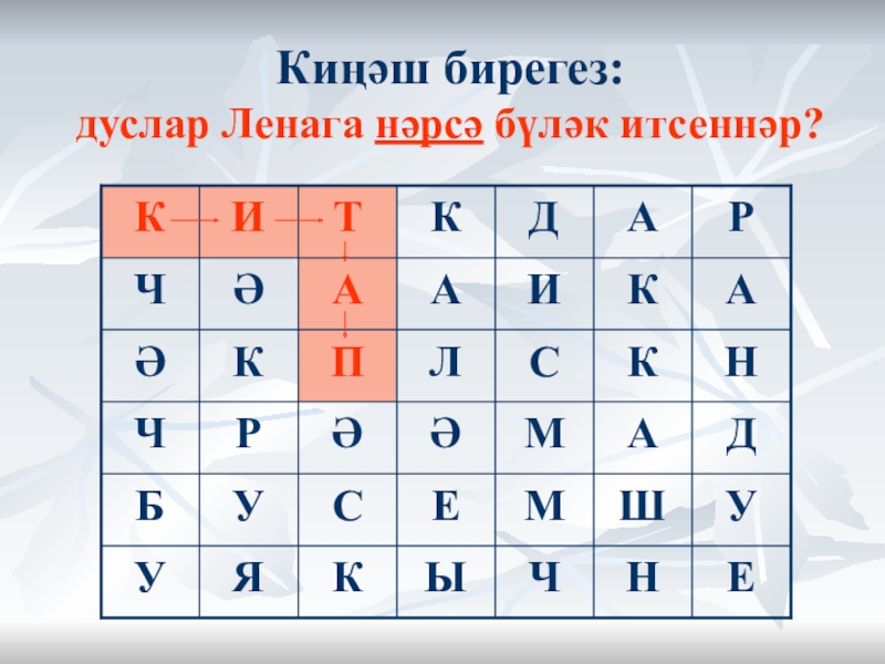 Слайд 12Киңәш бирегез: дуслар Ленага нәрсә бүләк итсеннәр?