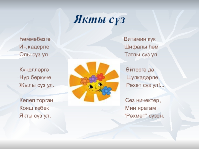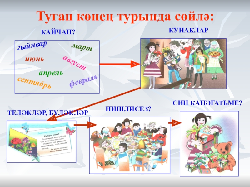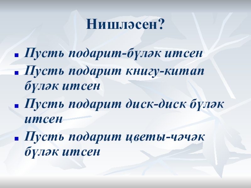 Нишләсен?Пусть подарит-бүләк итсенПусть подарит книгу-китап бүләк итсенПусть подарит диск-диск бүләк итсенПусть подарит цветы-чәчәк бүләк итсен
