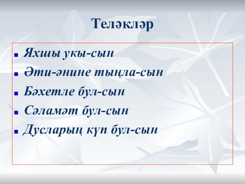 ТеләкләрЯхшы укы-сынӘти-әнине тыңла-сынБәхетле бул-сынСәламәт бул-сынДусларың күп бул-сын