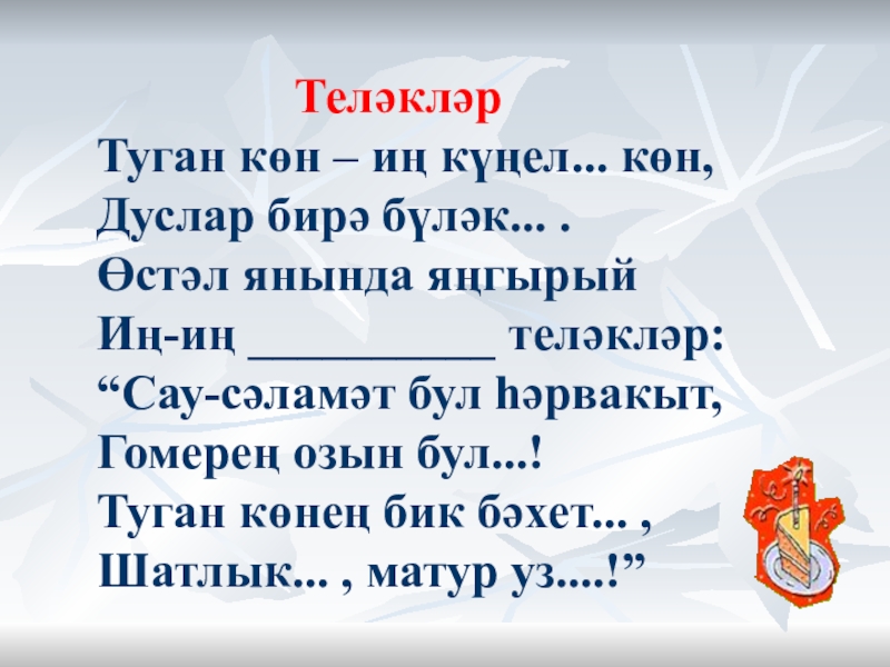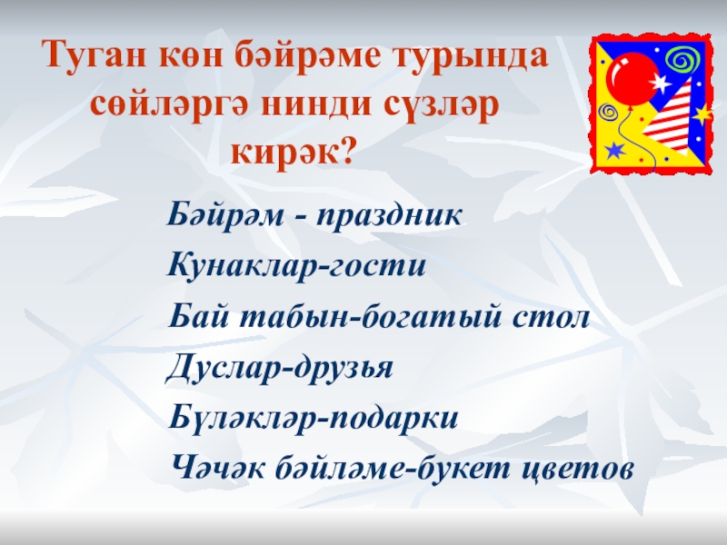 Слайд 2Туган көн бәйрәме турында сөйләргә нинди сүзләр кирәк?