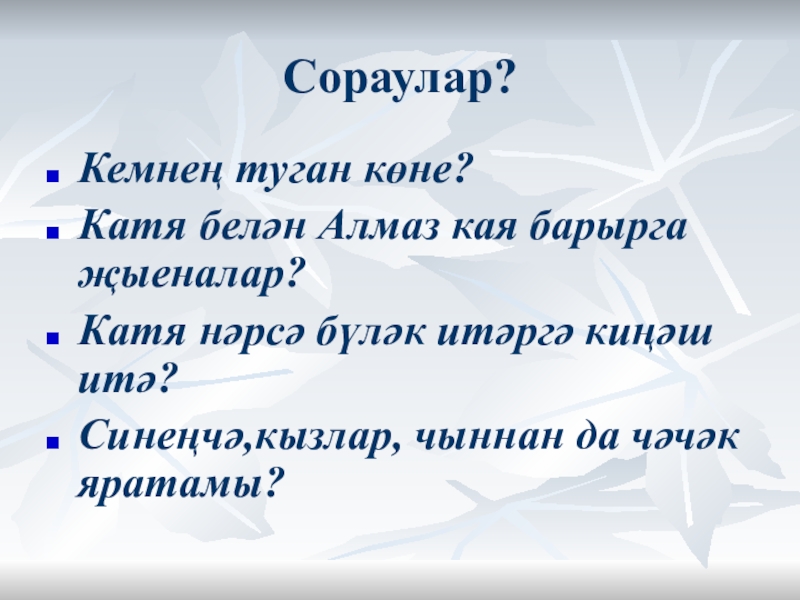 Сораулар?Кемнең туган көне?Катя белән Алмаз кая барырга җыеналар?Катя нәрсә бүләк итәргә киңәш итә?Синеңчә,кызлар, чыннан да чәчәк яратамы?