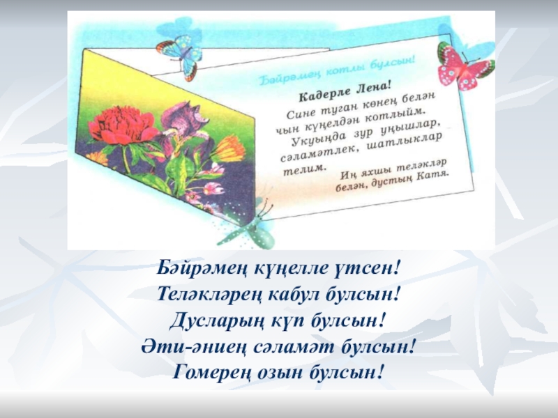 Слайд 14Бәйрәмең күңелле үтсен! Теләкләрең кабул булсын! Дусларың күп булсын! Әти-әниең сәламәт булсын! Гомерең озын булсын!