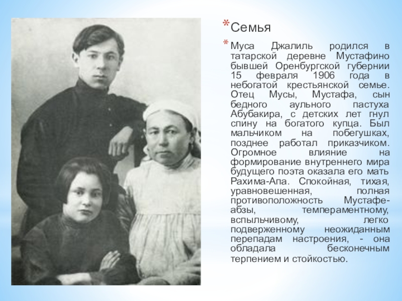 февраля 1906 года в небогатой крестьянской семье. Отец Мусы, Мустафа, сын бедного аульного пастуха Абубакира, с детских лет гнул спину на богатого купца. Был мальчиком на побегушках, позднее работал приказчиком. Огромное влияние на формирование внутреннего мира будущего поэта оказала его мать Рахима-Апа. Спокойная, тихая, уравновешенная, полная противоположность Мустафе-абзы, темпераментному, вспыльчивому, легко подверженному неожиданным перепадам настроения, - она обладала бесконечным терпением и стойкостью.
