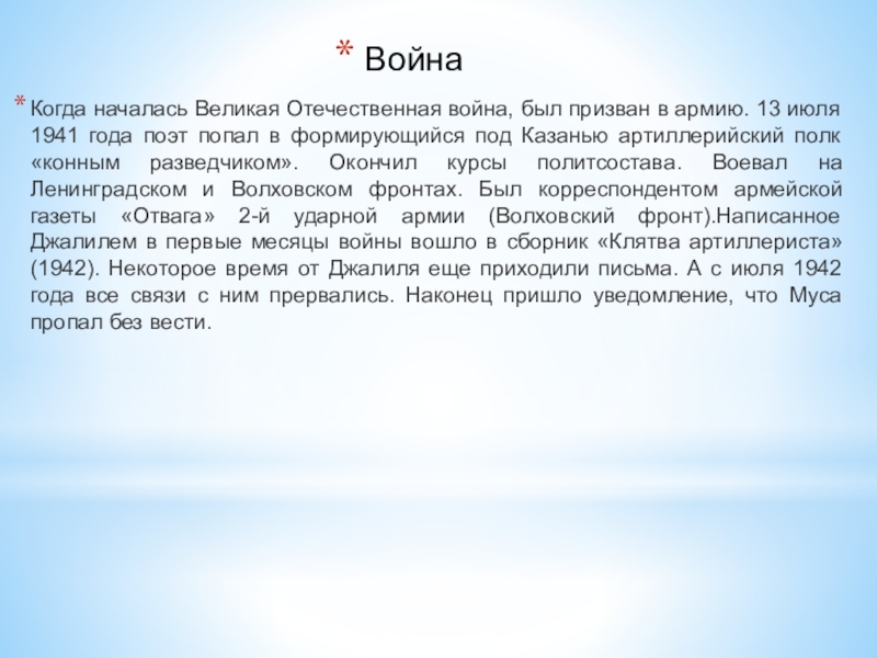 1941 года поэт попал в формирующийся под Казанью артиллерийский полк «конным разведчиком». Окончил курсы политсостава. Воевал на Ленинградском и Волховском фронтах. Был корреспондентом армейской газеты «Отвага» 2-й ударной армии (Волховский фронт).Написанное Джалилем в первые месяцы войны вошло в сборник «Клятва артиллериста» (1942). Некоторое время от Джалиля еще приходили письма. А с июля 1942 года все связи с ним прервались. Наконец пришло уведомление, что Муса пропал без вести.