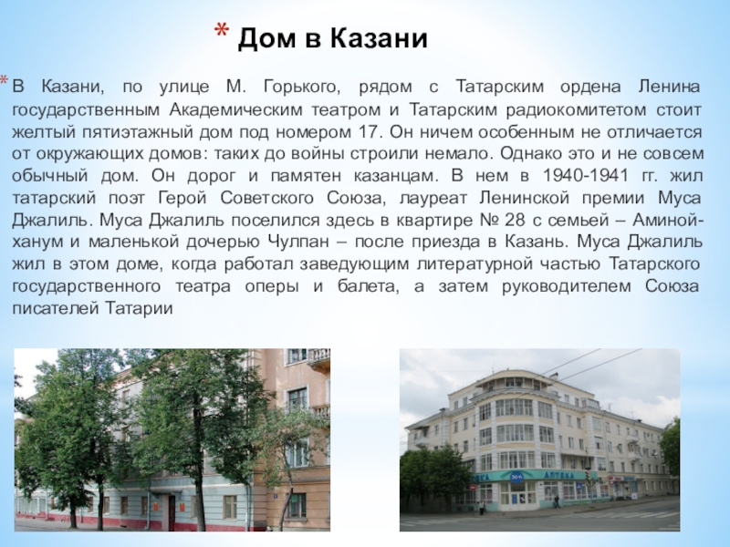 ордена Ленина государственным Академическим театром и Татарским радиокомитетом стоит желтый пятиэтажный дом под номером 17. Он ничем особенным не отличается от окружающих домов: таких до войны строили немало. Однако это и не совсем обычный дом. Он дорог и памятен казанцам. В нем в 1940-1941 гг. жил татарский поэт Герой Советского Союза, лауреат Ленинской премии Муса Джалиль. Муса Джалиль поселился здесь в квартире № 28 с семьей – Аминой-ханум и маленькой дочерью Чулпан – после приезда в Казань. Муса Джалиль жил в этом доме, когда работал заведующим литературной частью Татарского государственного театра оперы и балета, а затем руководителем Союза писателей Татарии