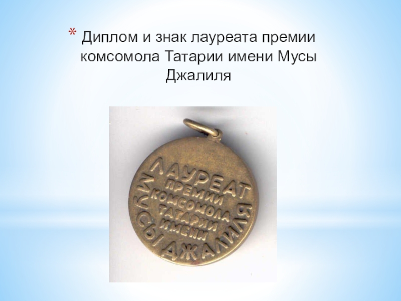 Слайд 16Диплом и знак лауреата премии комсомола Татарии имени Мусы Джалиля
