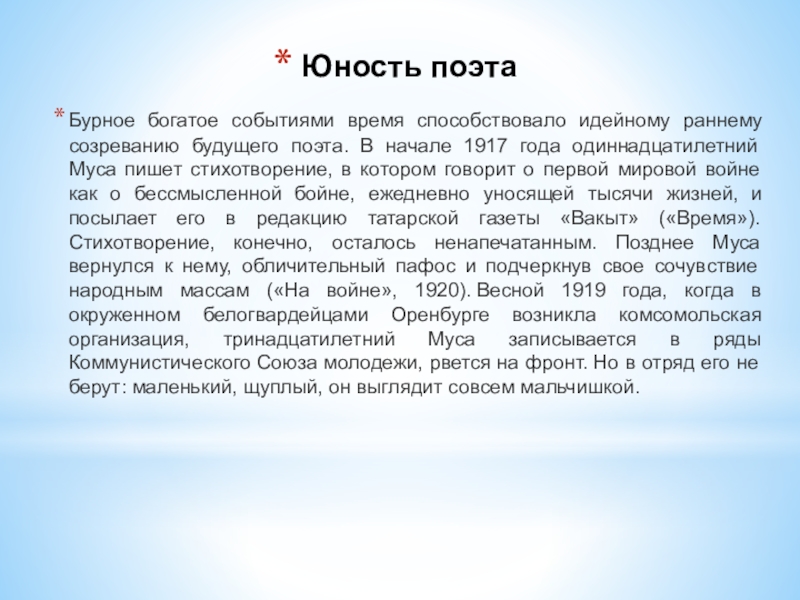 В начале 1917 года одиннадцатилетний Муса пишет стихотворение, в котором говорит о первой мировой войне как о бессмысленной бойне, ежедневно уносящей тысячи жизней, и посылает его в редакцию татарской газеты «Вакыт» («Время»). Стихотворение, конечно, осталось ненапечатанным. Позднее Муса вернулся к нему, обличительный пафос и подчеркнув свое сочувствие народным массам («На войне», 1920). Весной 1919 года, когда в окруженном белогвардейцами Оренбурге возникла комсомольская организация, тринадцатилетний Муса записывается в ряды Коммунистического Союза молодежи, рвется на фронт. Но в отряд его не берут: маленький, щуплый, он выглядит совсем мальчишкой.