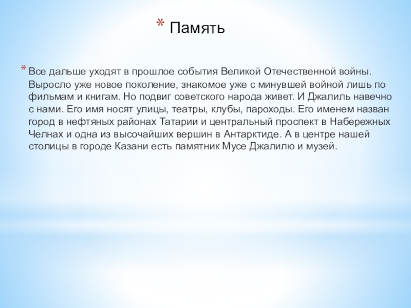 новое поколение, знакомое уже с минувшей войной лишь по фильмам и книгам. Но подвиг советского народа живет. И Джалиль навечно с нами. Его имя носят улицы, театры, клубы, пароходы. Его именем назван город в нефтяных районах Татарии и центральный проспект в Набережных Челнах и одна из высочайших вершин в Антарктиде. А в центре нашей столицы в городе Казани есть памятник Мусе Джалилю и музей.