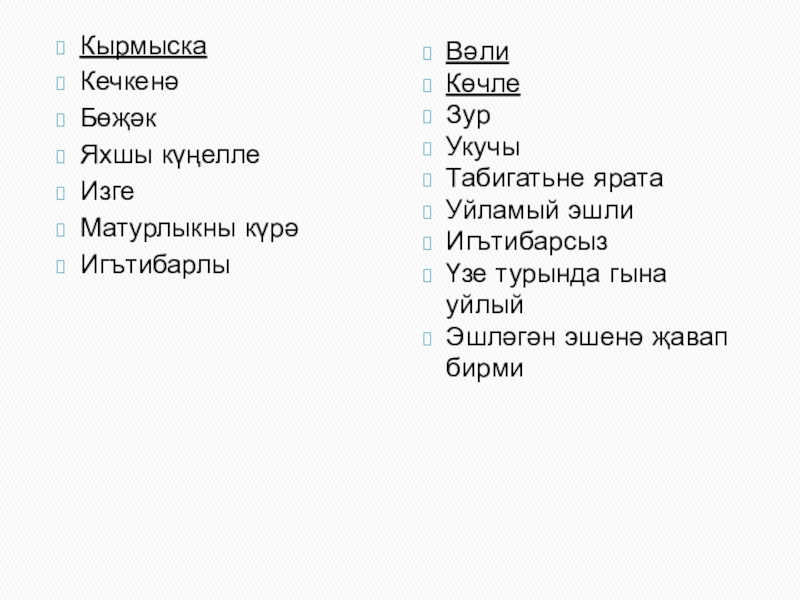 КырмыскаКечкенәБөҗәкЯхшы күңеллеИзгеМатурлыкны күрәИгътибарлыВәлиКөчлеЗурУкучыТабигатьне яратаУйламый эшлиИгътибарсызҮзе турында гына уйлыйЭшләгән эшенә җавап бирми