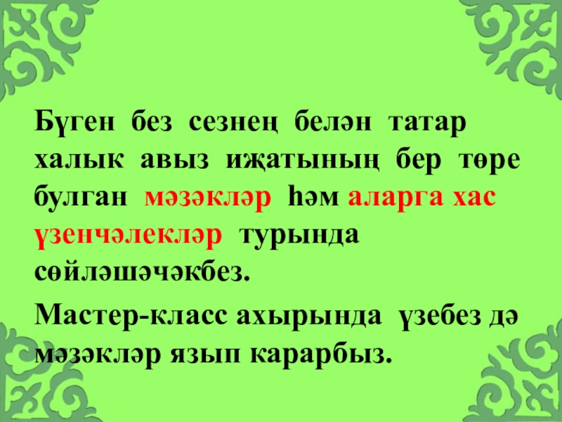 Слайд 3Бүген без сезнең белән татар халык авыз иҗатының бер төре булган
