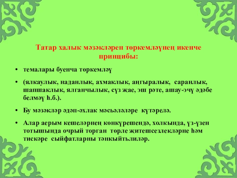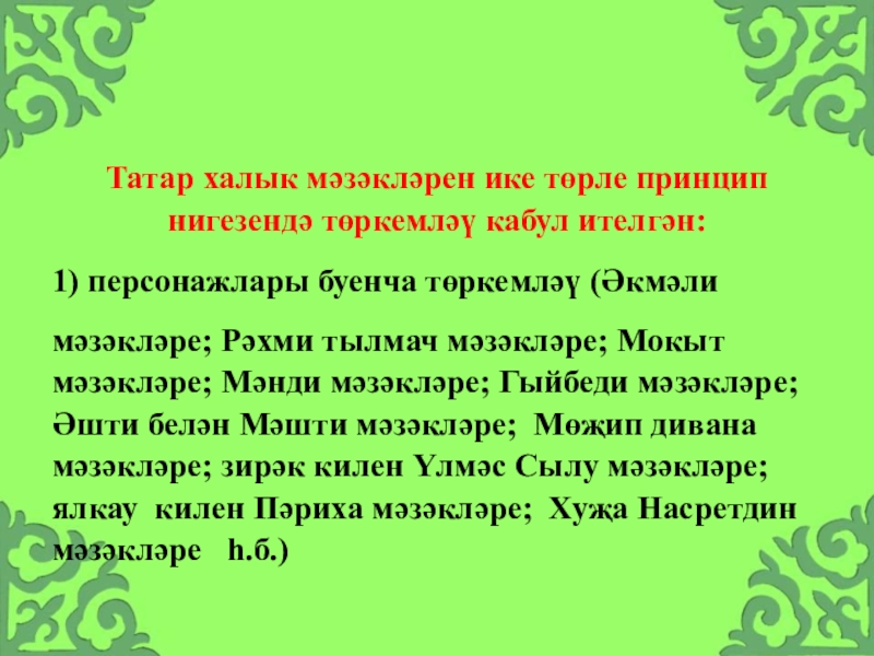 Слайд 14Татар халык мәзәкләрен ике төрле принцип нигезендә төркемләү кабул ителгән: