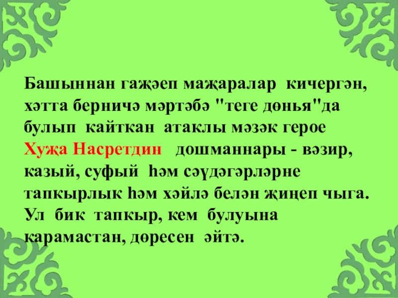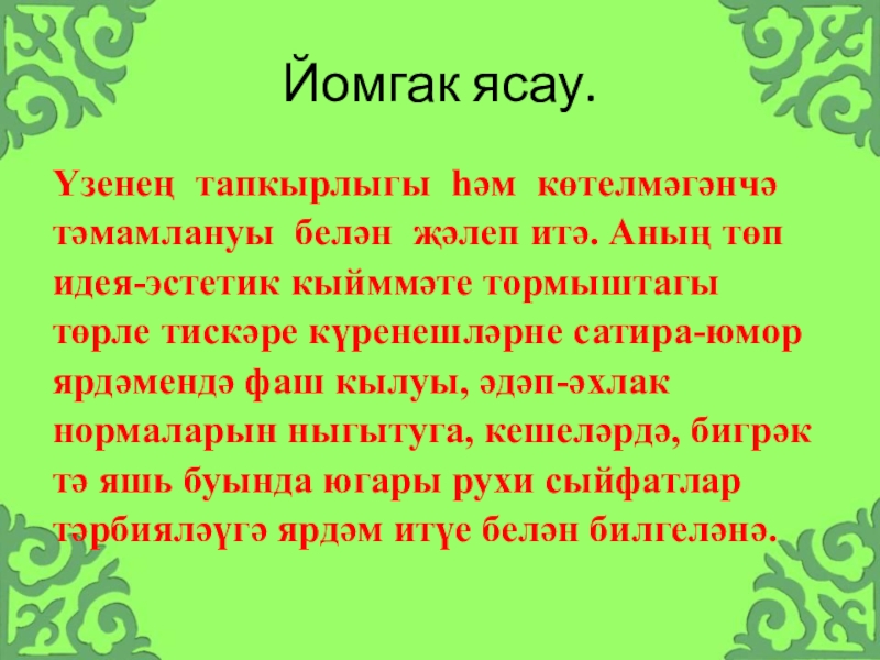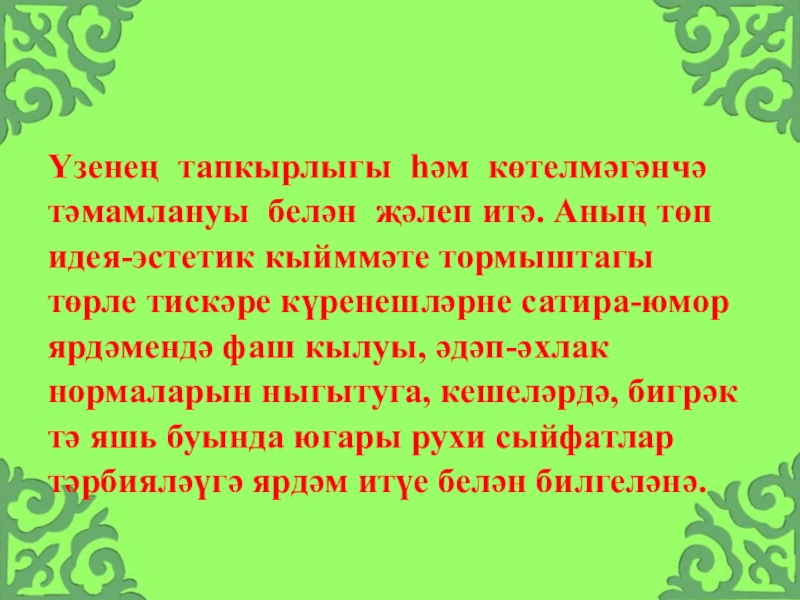 Слайд 20Үзенең тапкырлыгы һәм көтелмәгәнчә тәмамлануы белән җәлеп итә. Аның төп идея-эстетик
