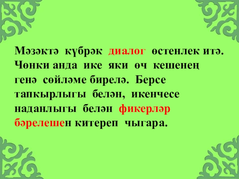 Слайд 19Мәзәктә күбрәк диалог өстенлек итә. Чөнки анда ике яки өч кешенең