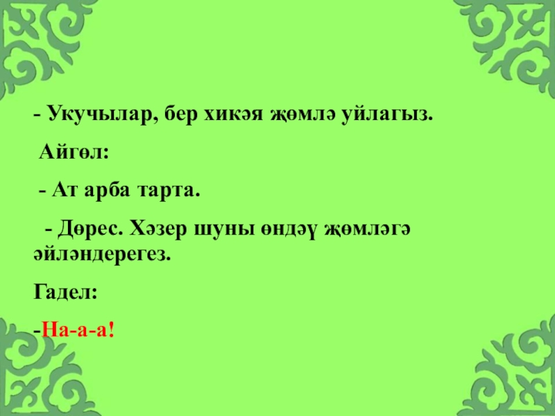 Слайд 28- Укучылар, бер хикәя җөмлә уйлагыз.