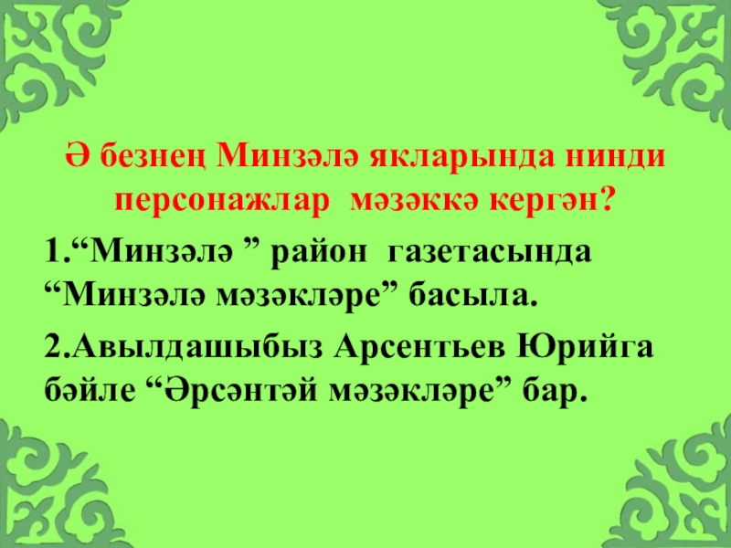 Слайд 15Ә безнең Минзәлә якларында нинди персонажлар мәзәккә кергән?