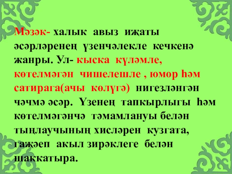 Слайд 6Мәзәк- халык авыз иҗаты әсәрләренең үзенчәлекле кечкенә жанры. Ул- кыска күләмле,