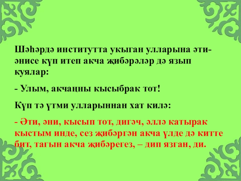 Слайд 33Шәhәрдә институтта укыган улларына әти-әнисе күп итеп акча җибәрәләр дә язып