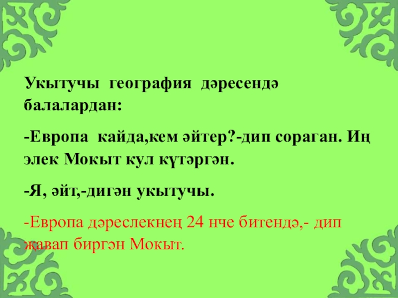 -Европа дәреслекнең 24 нче битендә,- дип җавап биргән Мокыт.