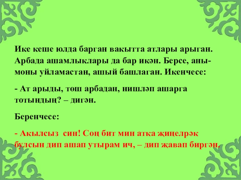 Слайд 31Ике кеше юлда барган вакытта атлары арыган. Арбада ашамлыклары да бар