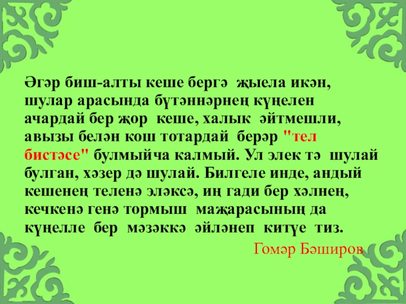 Слайд 5Әгәр биш-алты кеше бергә җыела икән, шулар арасында бүтәннәрнең күңелен ачардай