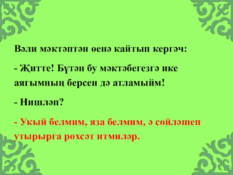 Слайд 30Вәли мәктәптән өенә кайтып кергәч: