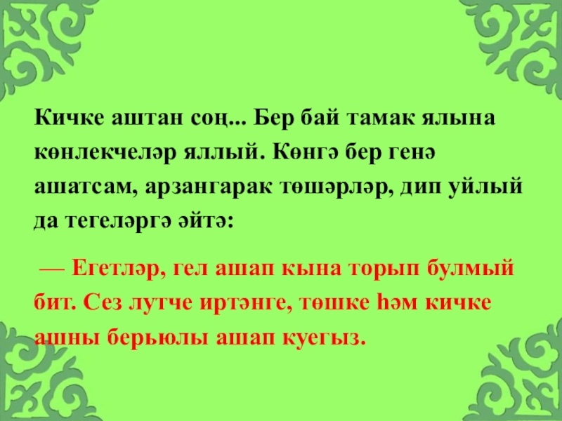 Слайд 25Кичке аштан соң... Бер бай тамак ялына көнлекчеләр яллый. Көнгә бер