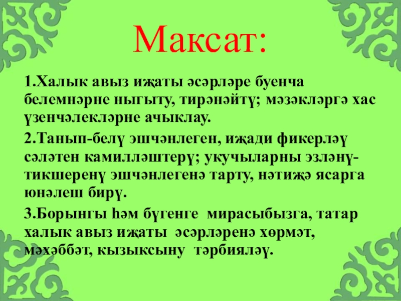 3.Борынгы һәм бүгенге мирасыбызга, татар халык авыз иҗаты әсәрләренә хөрмәт, мәхәббәт, кызыксыну тәрбияләү.