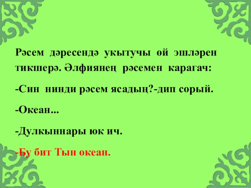 Слайд 24Рәсем дәресендә укытучы өй эшләрен тикшерә. Әлфиянең рәсемен карагач: