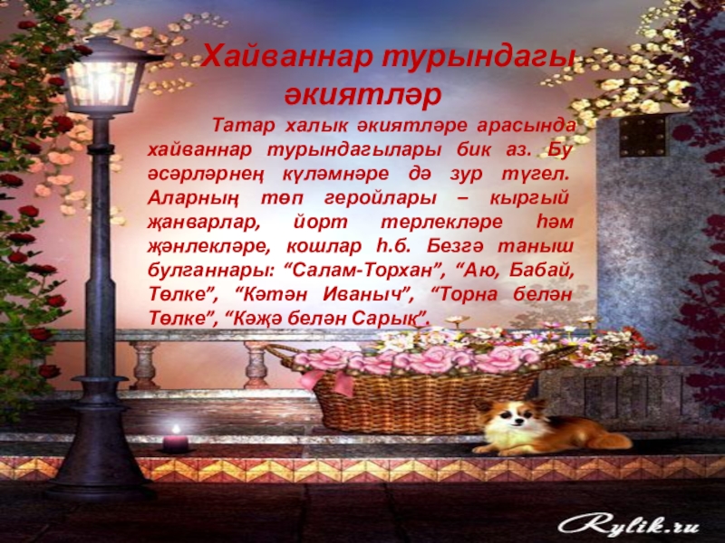 Татар халык әкиятләре арасында хайваннар турындагылары бик аз. Бу әсәрләрнең күләмнәре дә зур түгел. Аларның төп геройлары – кыргый җанварлар, йорт терлекләре һәм җәнлекләре, кошлар һ.б. Безгә таныш булганнары: “Салам-Торхан”, “Аю, Бабай, Төлке”, “Кәтән Иваныч”, “Торна белән Төлке”, “Кәҗә белән Сарык”.