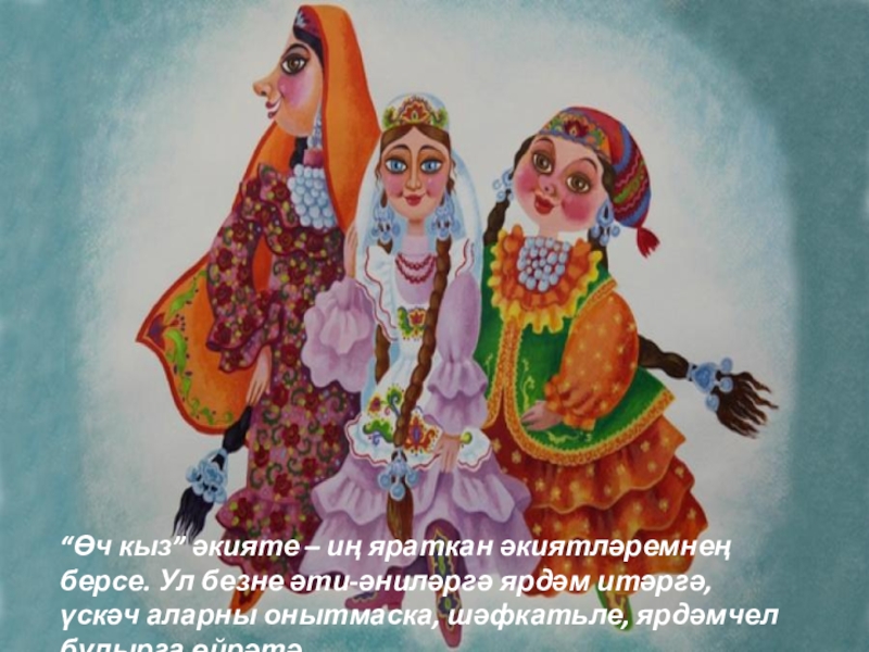 Слайд 15“Өч кыз” әкияте – иң яраткан әкиятләремнең берсе. Ул безне әти-әниләргә